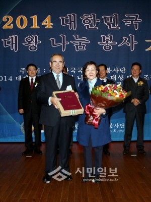 신연희 서울 강남구청장(오른쪽)이 지난 8일 오후 2시 여의도 국회도서관 강당에서 열린 ‘2014 세종대왕 나눔봉사대상 시상식’에서 이수성 전 국무총리(왼쪽)에게 ‘아름다운 대 한국인상’을 받고 기념촬영을 하고 있다.(사진제공=강남구청)