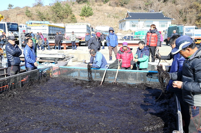 지난 9일 전남 고흥군 도화면 물김 위판장에서 김 양식 어업인들이 출하한 올해 김밥용 물김 첫 위판이 열리고 있다. 올해는 수온하강 등 어장환경 호전으로 지난해 생산량 4만7550톤에 315억원을 웃도는 5만5000톤에 400억원 목표 달성이 전망된다.