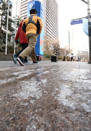 낮부터 찬바람이 불면서 낮 최고기온이 1도선에 머문 11일 오후 서울 중구의 한 도로가 빙판길로 변해 시민들이 종종걸음을 하고 있다.