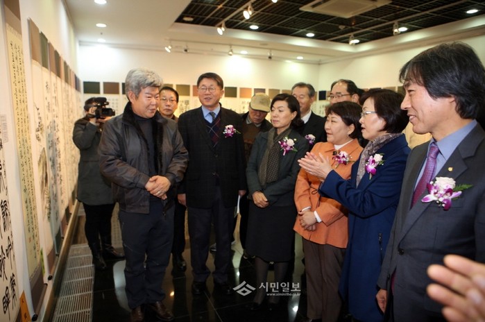 지난 9일 서울 강남구 역삼1 문화센터에서 열린 ‘제16회 강남서예문인화대전’에 참석한 신연희 강남구청장(오른쪽에서 두 번째)이 관계자들과 함께 설명을 들으며 전시작품을 구경하고 있다.(사진제공=강남구청)