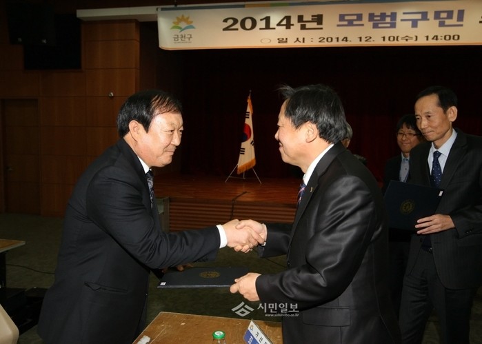 지난 10일 서울 금천구청 대강당에서 지역사회 발전과 마을공동체 회복을 위해 헌신한 모범구민들을 발굴해 자긍심을 고취시키고 다른 주민들의 귀감으로 삼기 위한 '2014년 모범구민 표창장 수여식'이 열렸다. 사진은 표창장을 수여 중인 차성수 구청장(오른쪽)의 모습.(사진제공=금천구청)