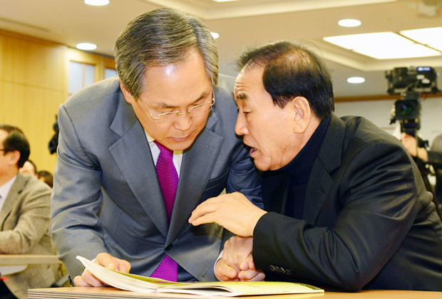 새누리당 이재오 의원과 새정치민주연합 우윤근 원내대표가 11일 오전 서울 여의도 국회 의원회관에서 열린 ‘권력구조개편과 헌법개정, 대통령을 중심으로’ 정책토론회에서 대화를 나누고 있다