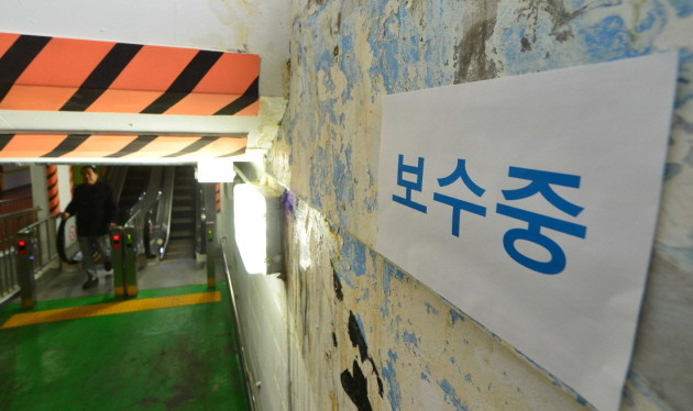 11일 오후 서울 제2롯데월드 지하 잠실역 공영주차장 출입구 부분 벽에 물이 새는 가운데 이곳에 '보수중' 안내문이 붙어 있다. 물이 새는 곳은 서울 잠실역 10번 출구와 이어지는 잠실공영주차장 출입구 부분으로 제2롯데월드와 공영주차장 차량 출구 아래 층이다. 서울시설공단은 지난달 누수 사실을 확인하고 롯데건설에 조치를 요구했고, 롯데건설이 한차례 보수공사를 했지만 누수는 이어지고 있다.