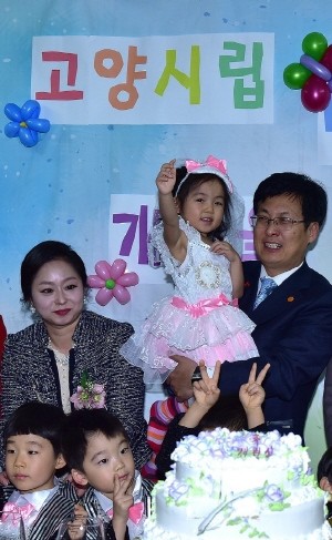 경기 고양시 일산서구에 위치한 고양시립대화소망어린이집에서 열린 '어린이집 개원식'에 참석한 최성 시장(오른쪽)이 내빈을 비롯한 어린이집 원아들과 함께 기념사진 촬영을 하고 있다. (사진제공=고양시청)