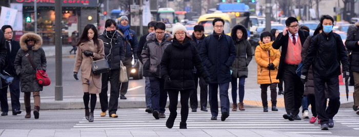 서울 아침 기온이 영하 6도까지 내려가는 등 강추위가 지속된 12일 오전 서울 세종대로 사거리 출근길에서 시민들이 발걸음을 재촉하고 있다.