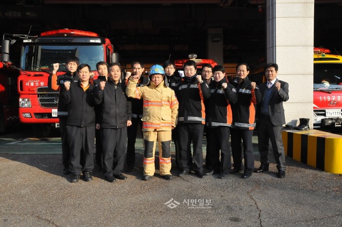 서울 동작소방서가 12일 오전 9시 본서 3층 강당에서 시민을 명예소방관으로 발굴해 민간자율 소방안전문화를 확산시키고자 '서울시 명예소방관 위촉식'을 열었다. 사진은 이날 서울시 명예소방관으로 위촉된 이필준씨(왼쪽 세번째)와 소방서 관계자들이 기념촬영을 하는 모습. (사진제공=동작소방서)
