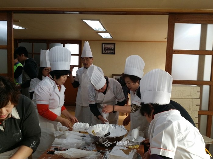 최근 자유총연맹 인천 남동구 간석4동 분회 회원들이 연말연시를 맞아 '무료 제빵 지원사업'의 일환으로 직접 케이크를 만들어 지역내 홀몸노인 100가구에 전달하는 '이웃사랑 나누기 케이크 전달행사'를 열었다. 사진은 케이크를 만드는 회원들의 모습. (사진제공=남동구청)