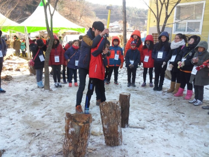 최근 경기 의정부시 송산2동 주민센터가 지역내 청소년을 대상으로 '양평 외갓집 체험마을'을 방문해 떡만들기, 김치담그기, 나무꾼 체험 등 다양한 활동으로 구성된 '청소년 겨울캠프'를 실시했다. 사진은 캠프 참여 학생들이 장작을 패며 나무꾼 체험을 하는 모습.