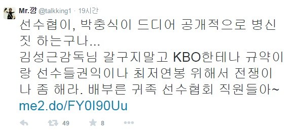 강병규는 16일 자신의 트위터 계정에 "선수협이, 박충식이 드디어 공개적으로 xx짓 하는구나"라며 강하게 비난했다. 이어 강병규는 "김성근감독님 갈구지 말고 KBO한테나 규약이랑 선수들권익이나 최저연봉 위해서 전쟁이나 좀 해라. 배부른 귀족 선수협회 직원들아~"라고 글을 남겼다.