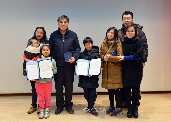 최근 경기 동두천 시립도서관, 꿈나무정보도서관이 아름다운문화센터 2층 한울림 공연장에서 '2014 하반기 책읽는가족' 시상식을 열고 도서관별 1가족씩을 선정해 시상했다. 수상자들은 각각 440, 409권을 대출해 책읽는 습관의 모범을 보였다. 사진은 시상식에 참여한 '책읽는가족' 수상자들의 모습. (사진제공=동두천시청)