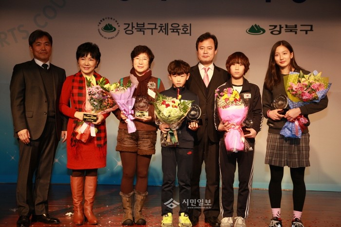 지난 15일 오후 5시 서울 강북구청 강당에서 올 한 해 동안 각종 체육대회에서 강북구를 빛낸 엘리트 선수들과 강북구 체육발전 유공자를 격려하기 위해 '강북구 체육상 시상식'이 열렸다. 사진은 강북구체육회의 회장을 맡고 있는 박겸수 구청장(오른쪽에서 세번째)과 강북구 체육발전 유공자들이 함께 기념촬영을 하고 있는 모습. (사진제공=강북구청)
