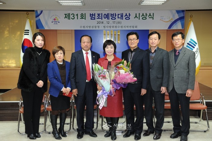 17일 한명숙 수원시의회 의원이 수원지방검찰청에서 열린 '제31회 범죄예방대상 시상식'에서 13년째 청소년 선도활동을 펼쳐온 공을 인정받아 청소년선도유공 법무부 장관 표창을 받았다. 사진은 시상식에 참여한 한 의원(가운데)과 관계자들의 모습.(사진제공=수원시의회)