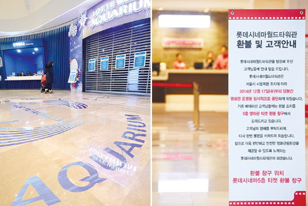 17일 오후 서울 송파구 제2롯데월드 아쿠아리움에 휴관을 알리는 안내문이 붙어 있다. 이원우 롯데물산 사장은 이날 오전 기자회견을 통해 “롯데월드몰 관련 계열사들은 아쿠아리움과 영화관에 대한 사용제한과 사고 재발방지대책 마련 등 서울시의 조치를 충실히 이행하겠다”고 밝혔다.