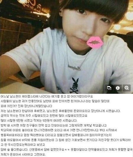 해당 글은 남소현의 학창생활에 대해 "남소현은 후배들에게 많이 시킬 땐 5만원, 작게는 5000원씩 여러 번 돈 모아오라고 시켰다" "방학 때 나와 친구들이 연락을 무시해서 안 모아오면 개학 날 학교 뒤 아파트 놀이터로 나오라고 해서 '내가 만만하냐'부터 시작해 행동 똑바로 하라고 했다" "친구들이랑 같이 담배·술 마시고 했다" "학교에서 담배도 걸렸다"고 주장했다.