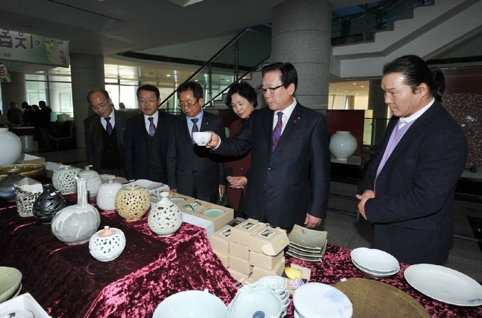지난 16일 경기 광주왕실도예조합이 우리 도자기의 아름다움을 알리고 지역내 불우이웃을 돕기 위해 시청 2층 로비에서 '2014년 불우이웃돕기 도자 바자회'를 열었다. 바자회 수익금 일부는 불우이웃돕기 성금으로 기탁된다. 사진은 바자회를 둘러보는 조병돈 시장(오른쪽에서 두번째)의 모습. (사진제공=광주시청)
