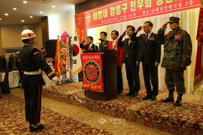 최근 서울 강동구 성내동의 한 컨벤션홀에서 열린 '해병대전우회 강동지회 송년의 날' 행사에 성임제 서울 강동구의회 의장이 참석해 평소 투철한 봉사정신과 사명감으로 지역의 화합과 발전을 위해 적극 노력하고 있는 전우회 관계자들에게 표창장을 수여하고 격려했다. 사진은 성 의장(오른쪽에서 세번째)과 관계자들의 모습. (사진제공=강동구의회)