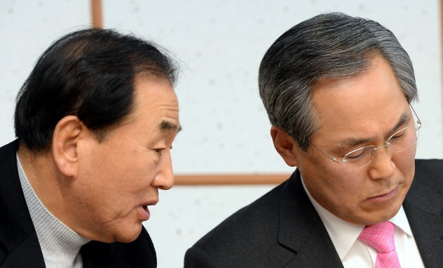 18일 오후 서울 여의도 국회 의원회관에서 열린 '개헌담론을 진단한다' 토론회에 참석한 이재오 새누리당 의원(왼쪽)과 우윤근 새정치민주연합 원내대표가 이야기를 나누고 있다.