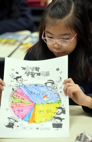 19일 오전 서울 동대문구 장안동 은석초등학교에서 방학을 맞은 어린이가 방학 생활계획표를 보고 있다.