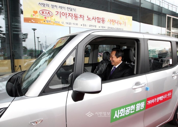 지난 19일 서울 금천구가 오후 3시30분 금천구청 앞 광장에서 기아자동차가 후원한 '사랑의 경차' 전달식을 개최한 가운데 이날 기아자동차측이 기증한 사랑의 경차 '레이'를 차성수 금천구청장이 시승하고 있다. (사진제공=금천구청)