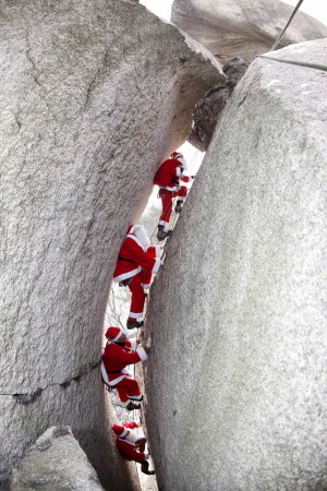 크리스마스를 나흘 앞둔 지난 21일 서울 북한산 영봉 밑 해골바위에서 김창곤 북한산 경찰 산악 구조대장과 대원들이 산타클로스 복장을 입고 침니 등반을 하고 있다.