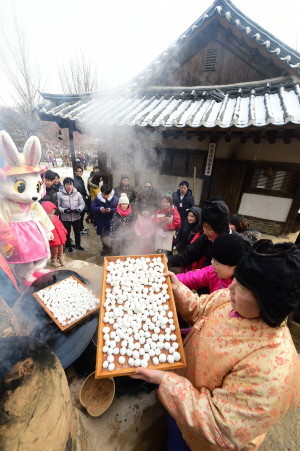 동지를 하루 앞둔 지난 21일 오후 경기 용인 한국민속촌에서 관람객들이 가마솥에 동지 팥죽을 만드는 모습을 살펴보고 있다.
