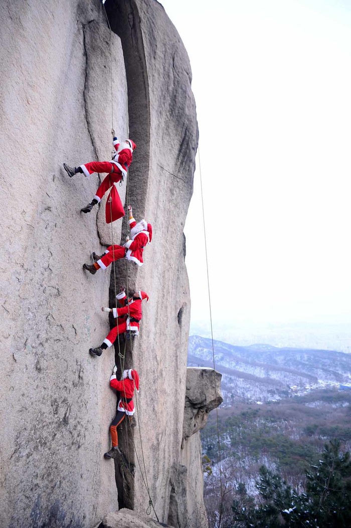 크리스마스를 나흘 앞둔 21일 서울 북한산 영봉 밑 해골바위에서 김창곤 북한산 경찰 산악 구조대장과 대원들이 산타클로스 복장을 입고 침니 등반을 하고 있다.