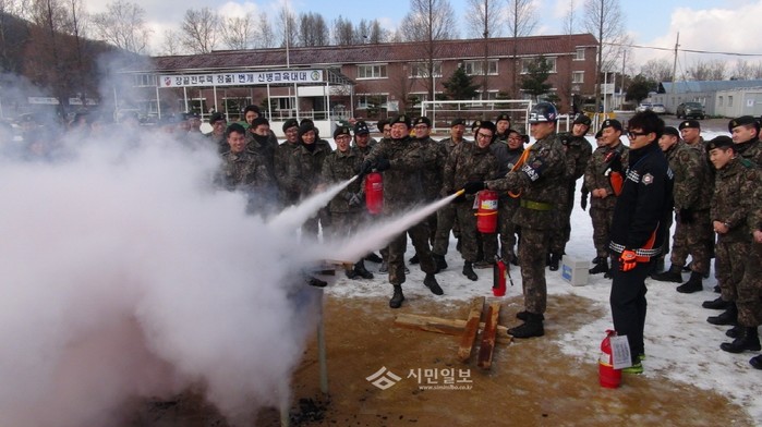 인천 부평소방서는 지난 22일 부평구에 위치한 제6617부대 육군장병 및 관계자 200여명을 대상으로 겨울철 화재예방을 위한 '소방안전교육'을 실시했다. 사진은 소화기를 이용한 화재진압체험을 진행하고 있는 모습. (사진제공=부평소방서)