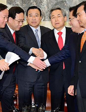 23일 오전 서울 여의도 국회 운영위원장실에서 운영위 소집, 부동산 3법 처리 등을 논의하기 위해 열린 주례회동에서 여야 원내지도부와 국토위 간사가 손을 맞잡고 있다. 왼쪽부터 왼쪽부터 새누리당 김재원 원내수석부대표, 주호영 정책위의장, 이완구 원내대표, 새정치민주연합 우윤근 원내대표, 백재현 정책위의장, 안규백 원내수석부대표.