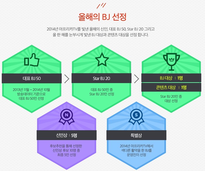 심사는 시청자 투표와 방송 데이터 합산, 심사위원단의 평가를 거쳐 대상, 신인상, 스타BJ 등 각 부문별 BJ 총 60명을 선발하고, 총 1억2000만원의 상금과 각종 부상을 수여한다.