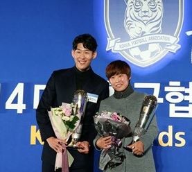 손흥민과 지소연은 23일 서울 용산구 백범김구기념관에서 열린 '2014 대한축구협회 시상식'에서 각각 남녀 올해의 선수상을 받으며 지난해에 이어 나란히 올해의 선수상을 거머쥐는 영예를 안았다.