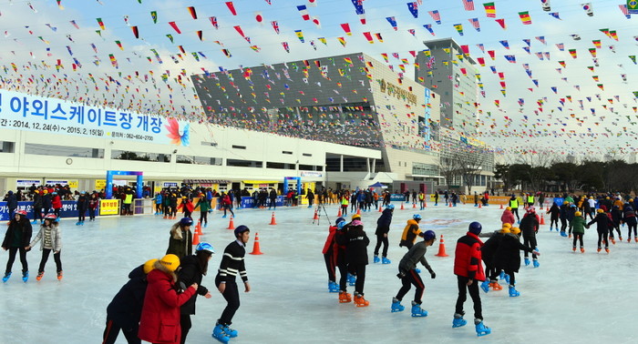 지난 24일 오전 광주 서구 광주시청 문화광장에 야외스케이트장이 문을 열었다. 야외스케이트장은 내년 2월15일까지 운영되며 시간당 1000원에 이용할 수 있다.