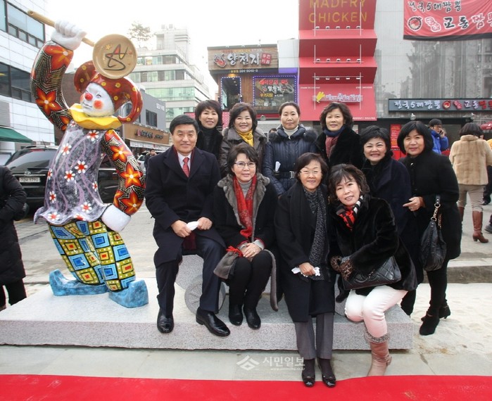 최근 서울 강남구 삼성동 음식문화 특화지역을 상징하는 ‘상징조형물 제막식’에 참석한 신연희 강남구청장(앞 열 오른쪽에서 두 번째)가 심윤조 국회의원(맨 왼쪽) 및 관계자들과 함께 조형물을 배경으로 기념촬영을 하고 있다. (사진제공=강남구청)