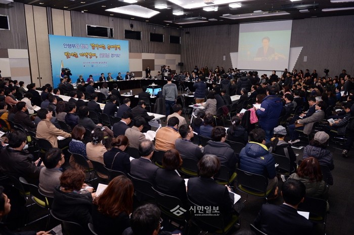 | ▲ 지난 11월 경기 고양 일산 킨텍스 2전시관에서 열린 경기지역 규제개혁 끝장토론회. 이날 토론회에서는 정종섭 안행부 장관, 남경필 경기도지사, 중앙부터 국과장, 경기도 관내 시장 및 부시장 등이 참석해 규제 애로사항 적극 개선으로 인한 투자 유치와 일자리 창출 지역경제 활성화 방안을 논의했다. | ||