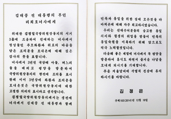 김정은은 "김정일 국방위원장 동지께서는 생전에 여사께서 김대중 전 대통령과 함께 민족과 통일을 위한 길에 모든 것을 다 바쳐온 데 대해 자주 회고하셨다"며 "우리는 선대 수뇌분들의 숭고한 통일 의지와 필생의 위업을 받들어 민족의 통일 숙원을 이룩하기 위해 앞으로도 적극 노력할 것"이라고 밝혔다.