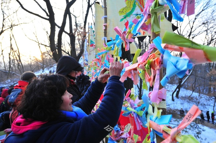 | ▲ 지난 1월 아차산 해맞이 축제에 참가한 시민들이 소원지를 적어 새끼줄에 매달고 있다. (사진제공=서울시청) | ||