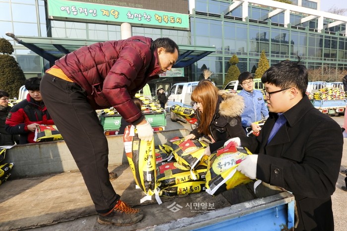 최근 인천 계양구청은 구청 남측광장에서 열린 '온누리감리교회 천사 사랑의 쌀 나눔' 행사를 통해 온누리감리교회에서 10kg 백미·1004포(2359만원 상당)를 전달받았다. 이 쌀은 계양구내 저소득가정에 전달될 예정이다. 사진은 쌀을 옮기는 봉사자들의 모습.(사진제공=계양구청)