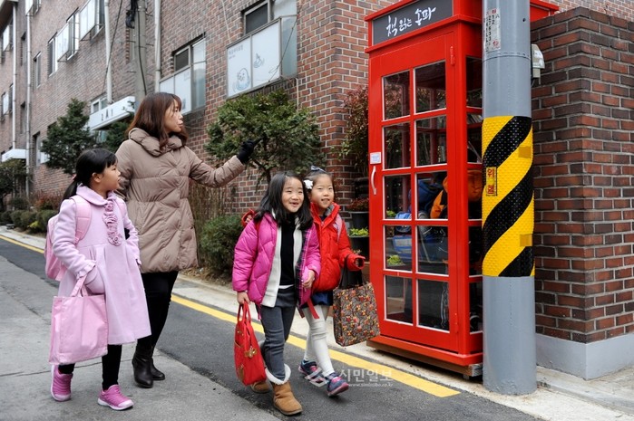 최근 주민들이 안전하게 다닐 수 있는 골목길로 개선하는 ‘골목길 경관개선 사업’을 완료한 서울 송파구 문정1동 골목길을 학부모와 아이들이 웃으며 등교하고 있다. (사진제공=송파구청)