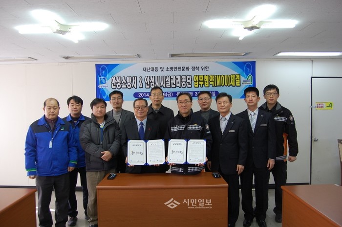 경기 안성소방서는 최근 안성문예회관에서 안성시설관리공단과 재해 또는 재난 발생 시 신속한 대처를 위해 비상대처 훈련 및 안전교육에 필요한 인력 장비 지원 등을 내용으로 한 안전하고 행복한 안성시민을 위한 업무협약을 체결했다. 사진은 협약식 후 기념촬영 중인 양기관 관계자들의 모습 (사진제공=안성소방서)