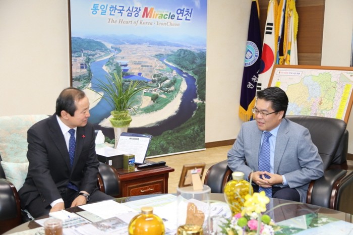 대한주택건설협회 경기도회는 연말을 맞아 지역내 소외된 노인, 장애인 등 어려운 이웃을 위해 26일 김규선 경기 연천군수를 면담하고, 연천군에 현금 500만원을 기탁했다. 사진은 이날 심광일 대한주택건설협회 경기도회장(오른쪽)을 면담하고 있는 김규선 연천군수(왼쪽)의 모습. (사진제공=연천군청)