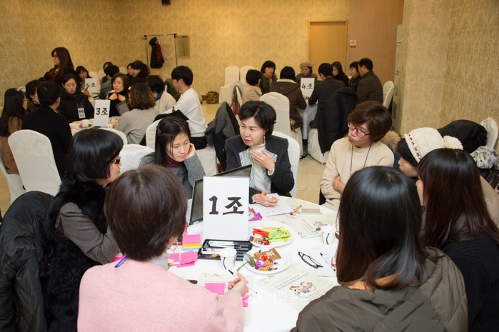 최근 양천구가 주민들의 다양한 의견을 모아 양천구의 교육을 바꾸고 '혁신교육지구 유치공모사업'에 반영하기 위한 토론회 '아이와 엄마가 행복한 100인의 원탁회의'를 열었다. 사진은 토론회에 참석해 주민들과 의견을 나누는 김수영 양천구청장(가운데)의 모습.(사진제공=양천구청)