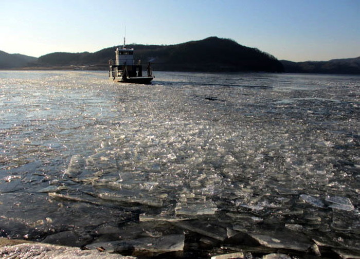 30일 경북 안동시 도산면 부포선착장에 정박 중인 차량도선 경북 제706호 주위 안동호에 두께 10㎝ 내외의 얼음이 얼어 있다.