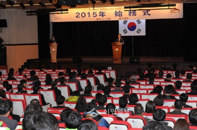 오전 8시 현충탑 참배에 이어 진행된 이날 시무식에는 박영순 구리시장과 손성오 부시장을 비롯해 600여 공직자가 참석한 가운데 진행됐다.