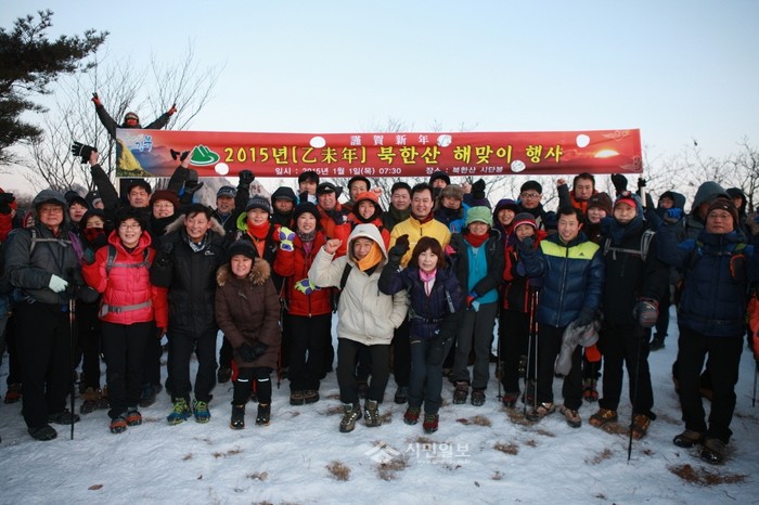 1일 서울 강북구는 2015년 을미년 새해를 맞아 북한산 시단봉에서 '2015년 북한산 해맞이 행사'를 주민과 함께했다. 사진은 박겸수 강북구청장이 북한산 시단봉에서 주민들과 함께 새해 새아침을 맞이하며 기념촬영을 하고 있는 모습. (사진제공=강북구청)