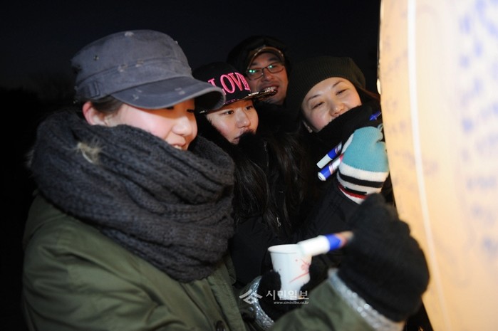 1일 청양의 해 을미년(乙未年)을 맞아 오전 서울 송파구 올림픽공원 몽촌토성 망월봉에서 열린 '2015 새해맞이 한마당'에 참석한 시민들이 송파구가 설치해 놓은 '희망볼'에 새해 소원을 적고 있다.(사진제공=송파구청)