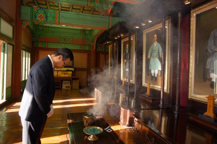 1일 성장현 서울 용산구청장이 ‘청양(靑羊)의 해’ 을미년 새해를 맞아 순국선열의 넋을 기리고 구정 업무수행을 위한 새로운 각오를 다지는 행사인 '2015년 새해맞이 효창원 참배'에 참석해 의열사 본전 앞에서 묵념을 하고 있다. (사진제공=용산구청)