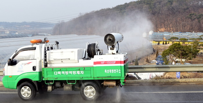 구제역 의심신고가 접수된 경기 용인 처인구 원삼면의 한 돼지농장 인근에서 5일 오후 경기도 축산위생연구소 방역차량이 방역활동을 벌이고 있다. 이날 이 농장에서는 돼지 3마리의 콧등에 수포가 생기는 등 구제역 의심증상이 발견됐다.