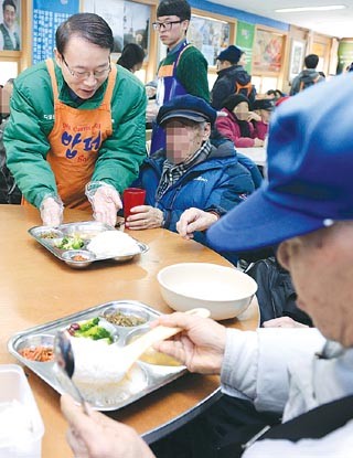 5일 서울 동대문구 밥퍼나눔운동본부에서 박승철헤어스투디오 임직원들이 행복나눔 시무식으로 배식봉사활동을 하고 있다.