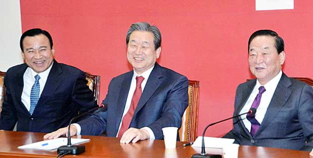 5일 오전 서울 여의도 국회 새누리당 대표실에서 열린 2015년 첫 최고위원회의에서 김무성 대표, 이완구 원내대표, 서청원 최고위원이 웃으며 이야기를 나누고 있다.