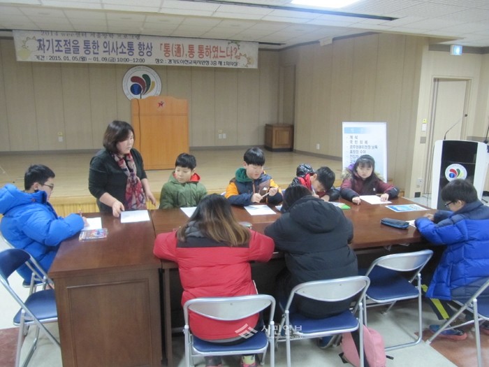 경기 이천교육지원청 Wee센터가 이달 5~9일 본청 제1회의실에서 초등학교 5·6학년을 대상으로 운영하는 '2015 Wee센터 겨울방학 프로그램' 가운데 '통(通), 통 통하였느냐?'에 참가한 학생들이 자기조절 관련 수업을 듣고 있다. (사진제공=이천교육지원청)