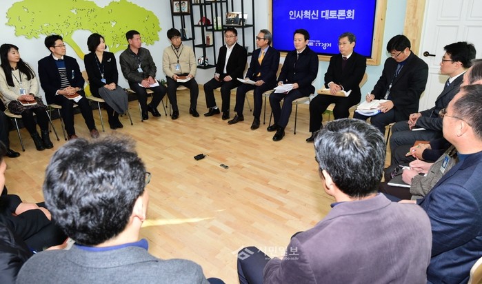 지난 7일 오전 경기 수원 경기도청 도지사 집무실에서 열린 '인사혁신 100분 토론한마당'에서 남경필 경기지사가 직원대표들과 인사혁신에 관한 토론을 갖고 있다. (사진제공=경기도청)